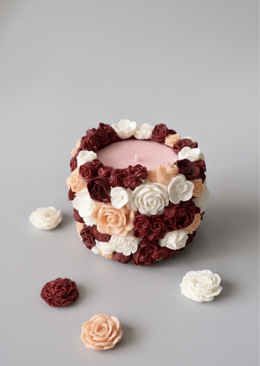 Each candle is carefully decorated with sculpted wax florals in soft blush, ivory, and deep berry tones, making it as much a decor piece as it is a sensory experience. Whether displayed unlit as art or lit at dusk for a soft glow, it brings romance, warmth, and serenity to any setting.