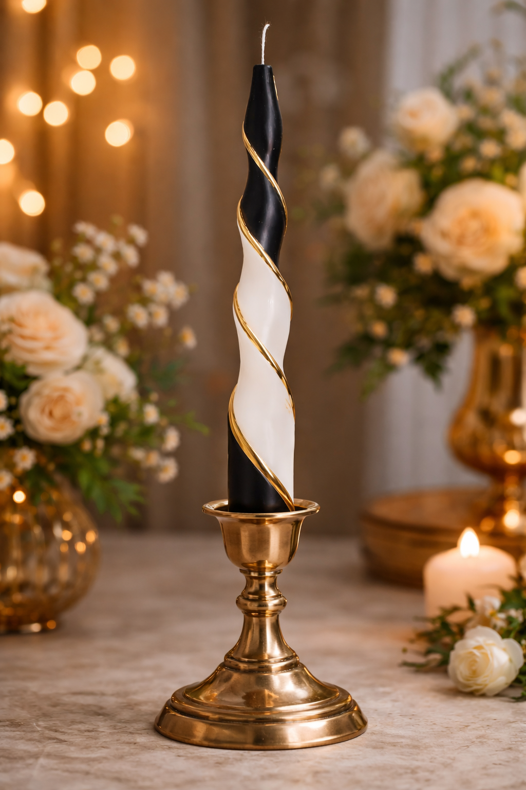 The Eclipse Royale Candle is designed to command attention. Sculpted in a striking spiral form, it features a dramatic contrast of black and ivory, elevated with subtle gold detailing for a touch of timeless luxury.